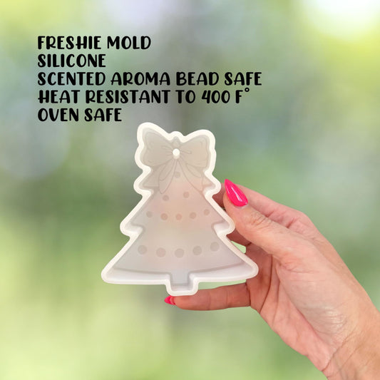 Christmas Tree with Bow Topper Silicone Freshie Mold 4.5x4” Treat Debbie Icing Car Candle Holiday Aroma Beads Oven Safe Winter