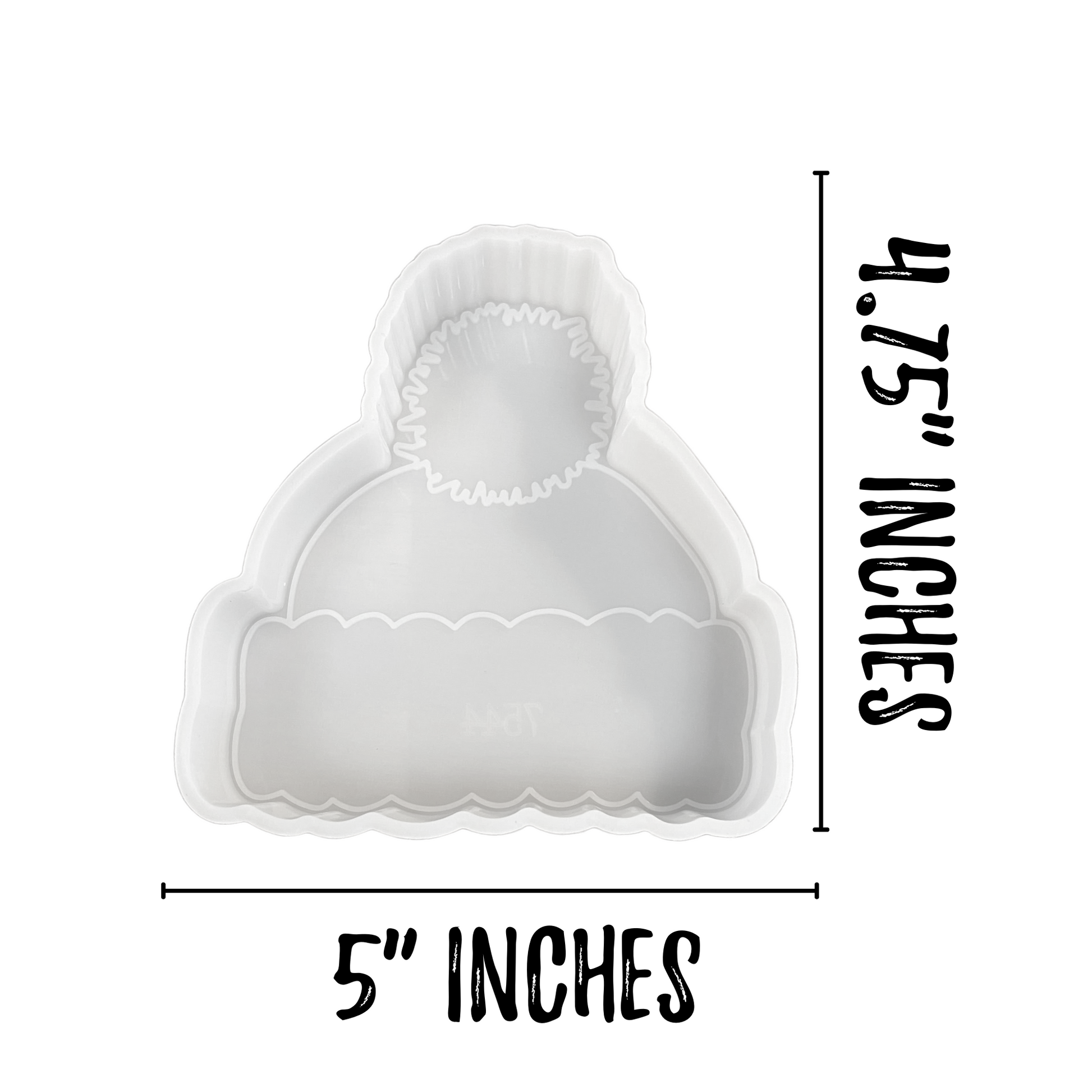 Includes 1 silicone mold in the shape of a Beanie Sock Hat Knit Cap Puff Ball. This mold measures 4.75” Tall x 5” Width x 1” Deep, a thick durable quality silicone mold.