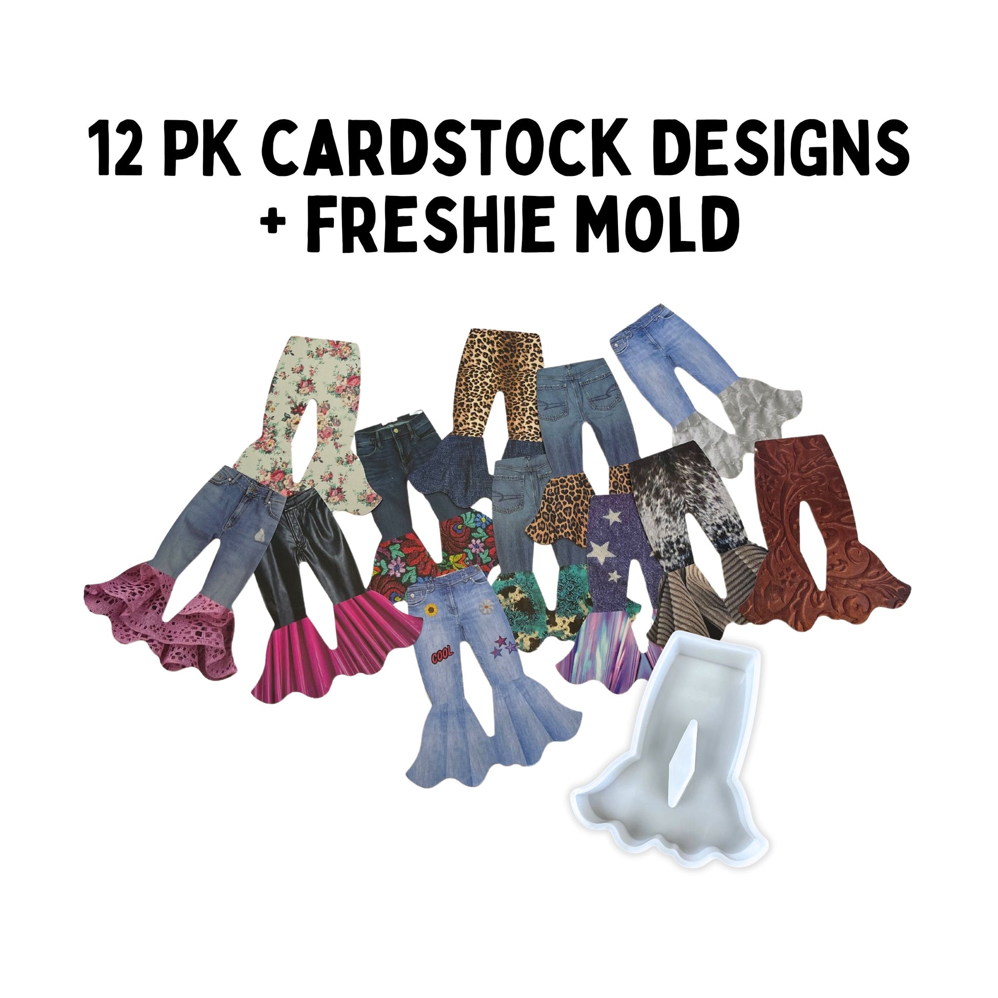 Dive into the spirit of the wild west and disco glam with either our 12 Pack of Bell Bottom Flare Pants exclusively designed for silicone freshie molds or just the 12 pack of cardstock. A perfect mix of style and utility for your car freshening needs. Each cardstock cutout, measuring 110mm x 197mm, is expertly crafted for use with Silicone Freshie Molds, offering a unique and trendy touch to your car's ambiance. This variety pack features an array of designs, seamlessly blending the themes of disco cowgirl, cowboy hat freshie, and western car freshie to infuse your vehicle with a distinct flair.