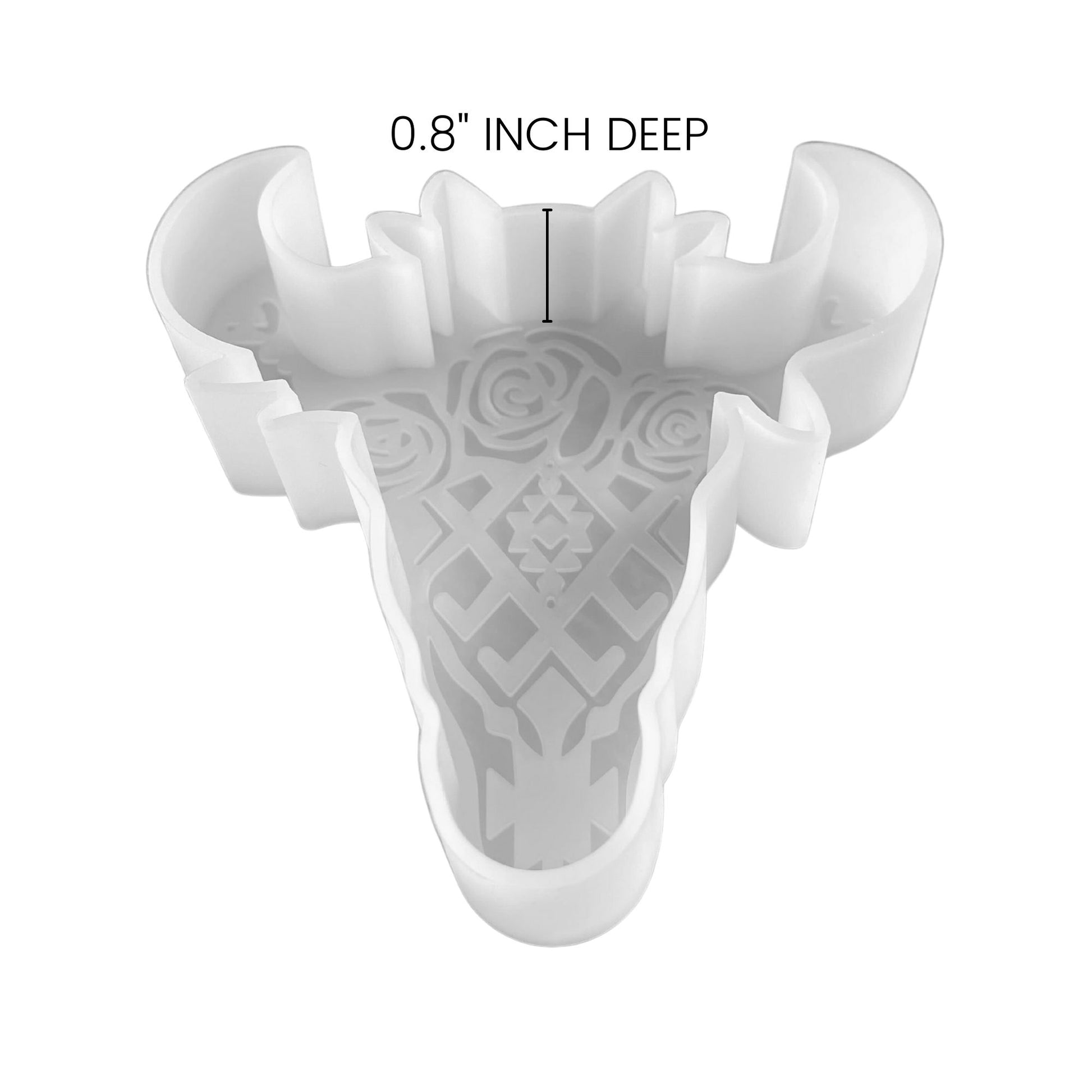 Includes 1 silicone mold in the shape of a Bull Skull with Flowers! This mold measures 4.75" Wide x 4.75" Long x 0.8" Deep, a thick durable quality silicone mold.