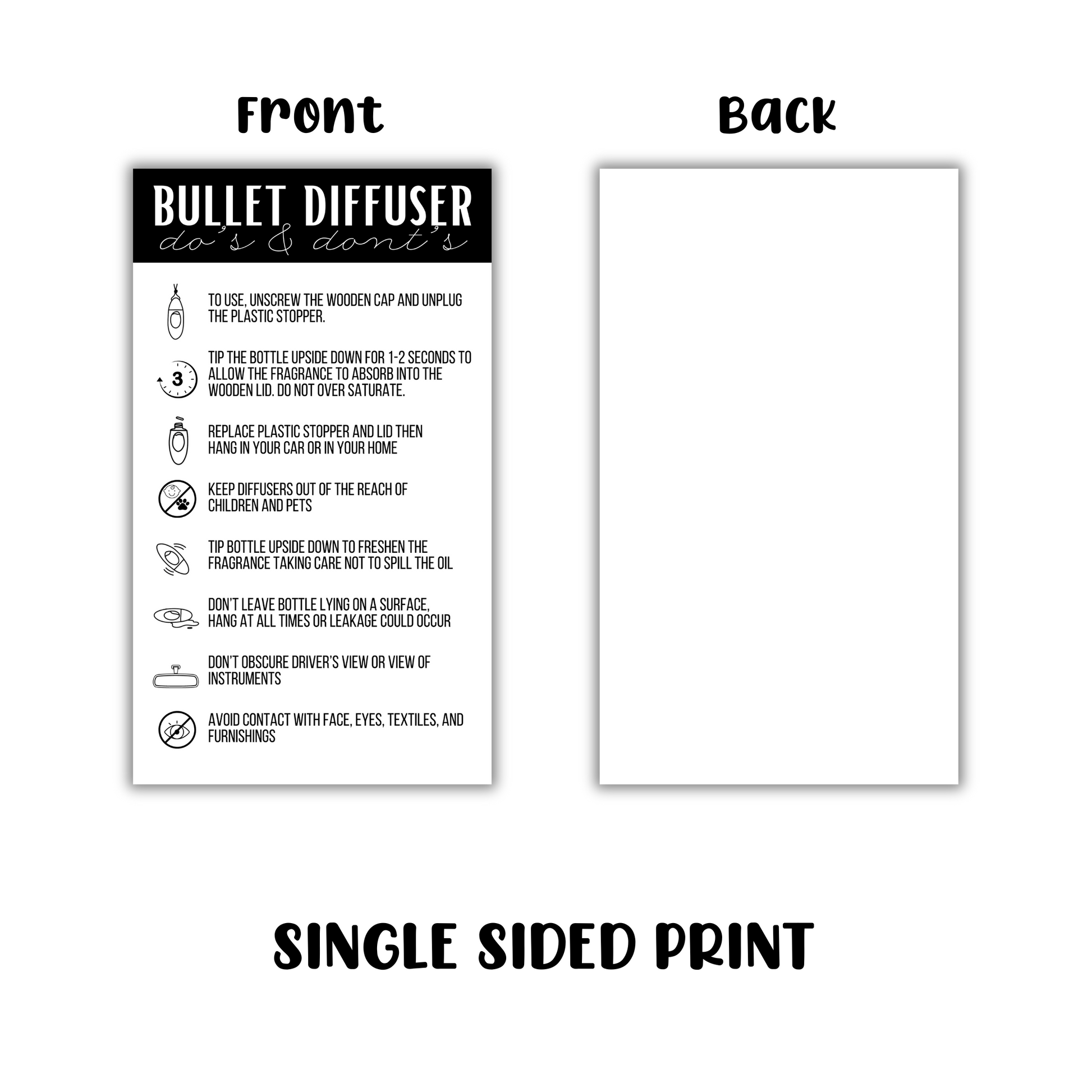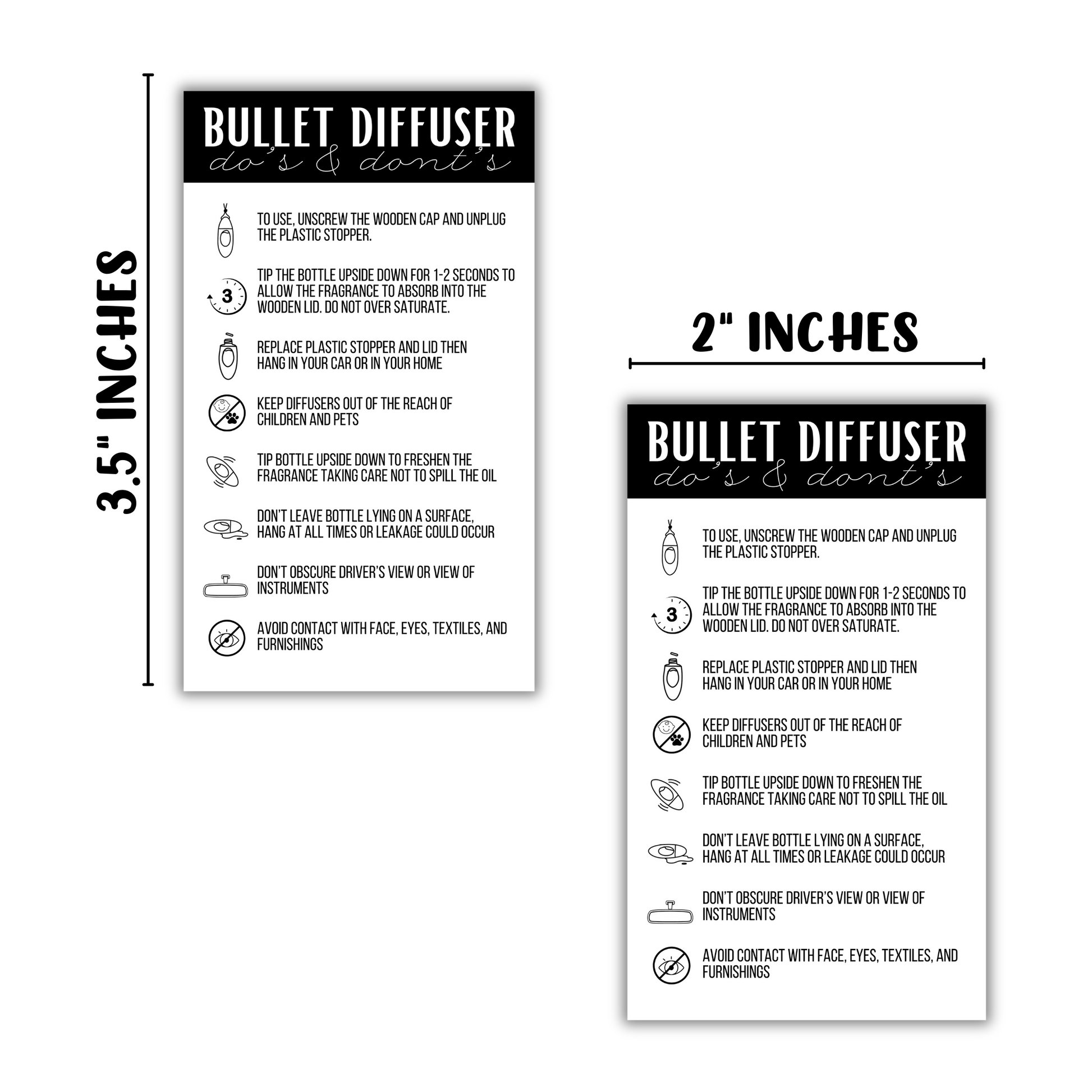 Unveil the perfect ambiance for your vehicle with our Bullet Diffuser Instructions (2x3.5”, 50 pk). These easy-to-follow instruction cards are designed specifically for users of car diffusers and air fresheners. Ideal for enhancing the user experience, our cards provide step-by-step guidance on setting up your car diffuser bullet, ensuring optimal performance.