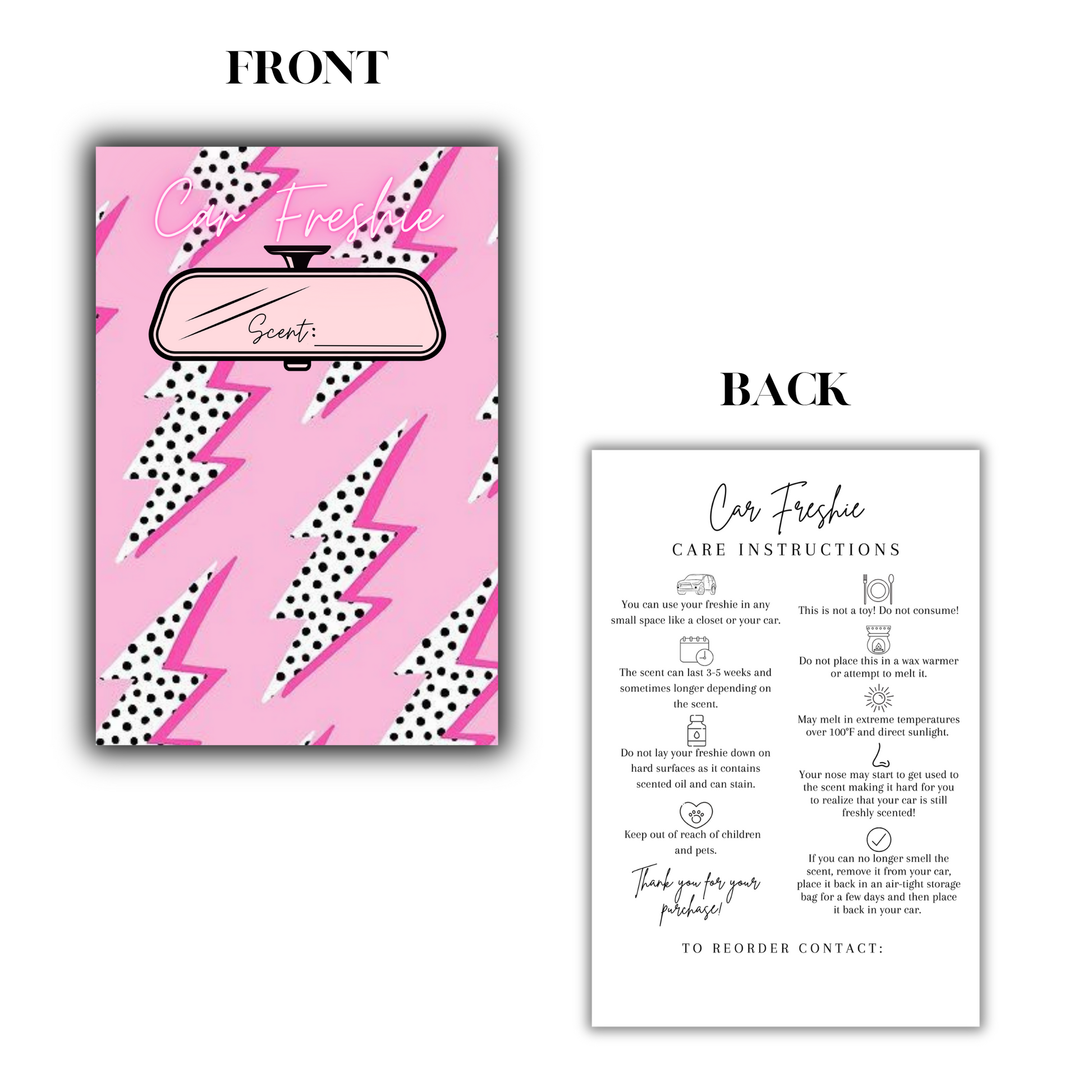- Complete Freshie Care: By including our detailed car freshie care instruction cards, you're showing your customers that you care about their experience beyond the sale. Proper usage guidelines ensure that the delightful fragrance of your freshies lasts longer, fostering customer satisfaction and loyalty.