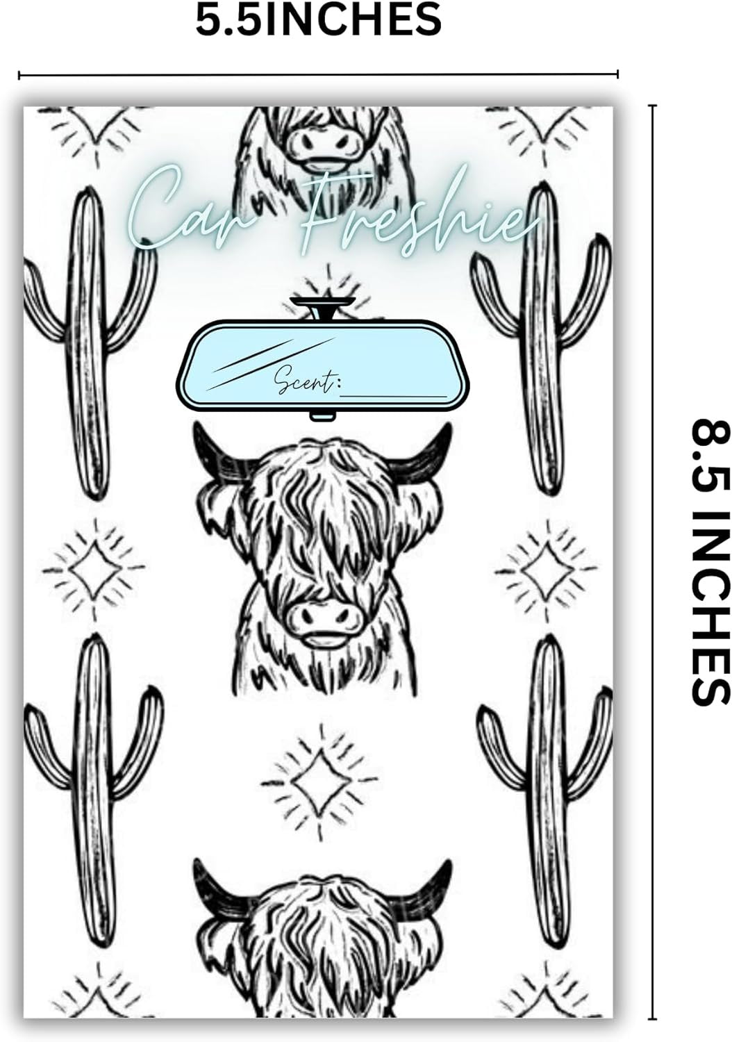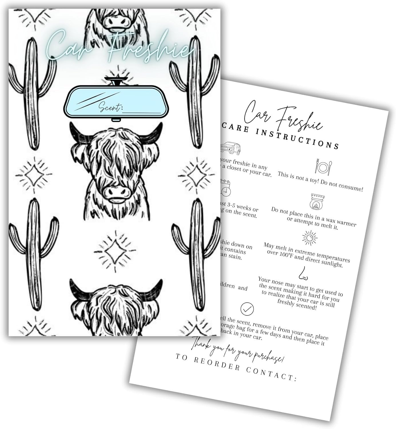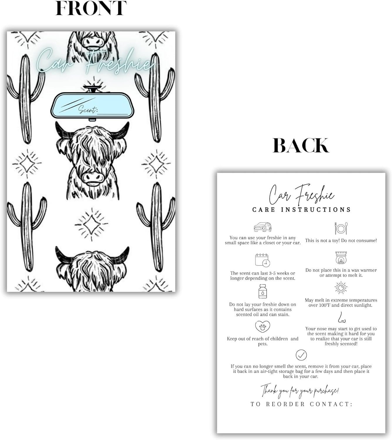 Car Freshie Insert Cards | 50 pk 5.5x8.5” Cactus Cow Modern Simple, fits in 6x9” for Holographic Bags Freshie Scent Label Care Instruction Cardstock