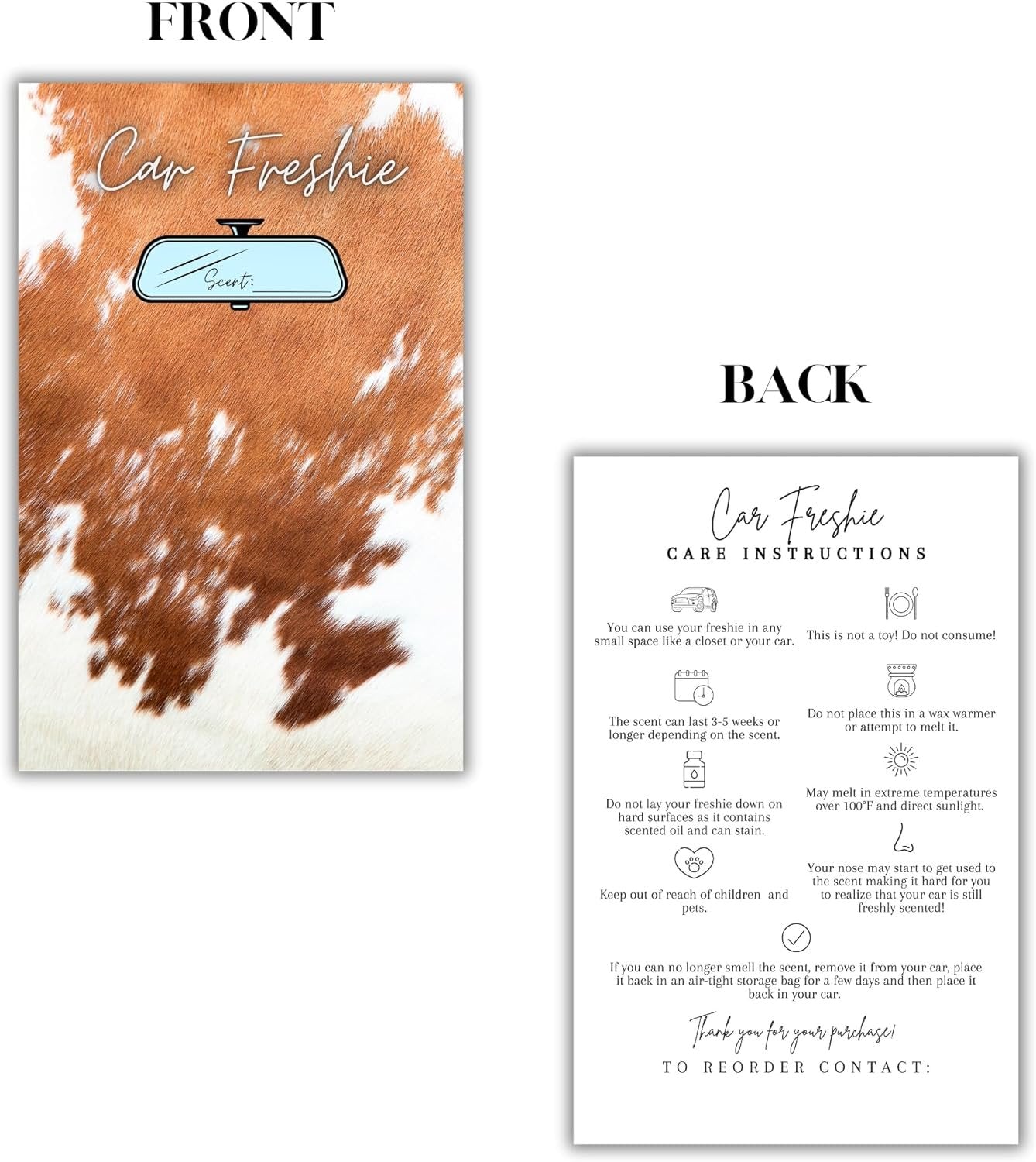 Car Freshie Insert Cards | 50 pk 5.5x8.5” Cow Print Western, fits in 6x9” for Holographic Bags Freshie Scent Label Care Instruction Cardstock