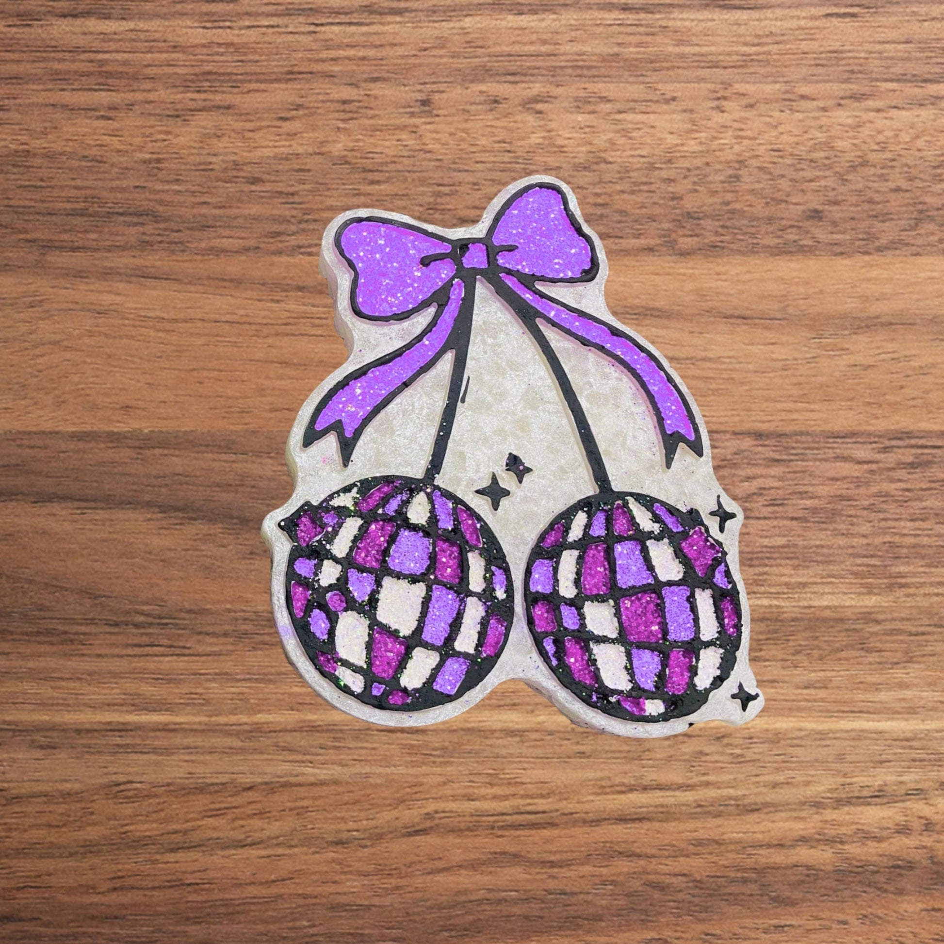Trendy Disco Cherry Design – Features cherries styled as disco balls with a cute bow, combining sweet charm with retro party flair for stylish, eye-catching freshies.