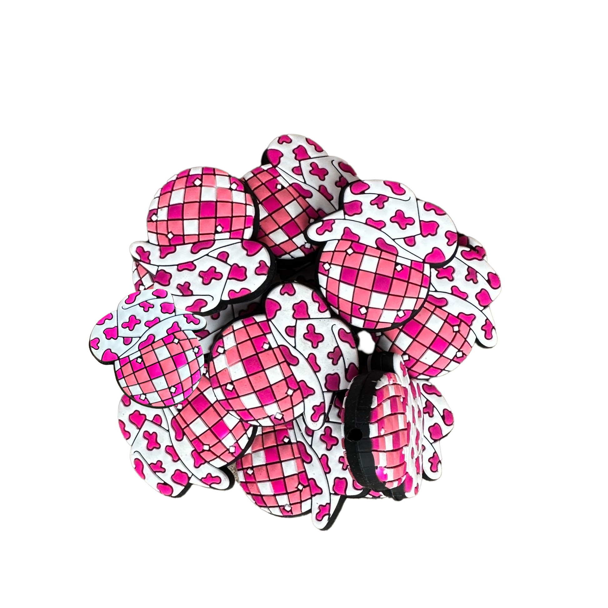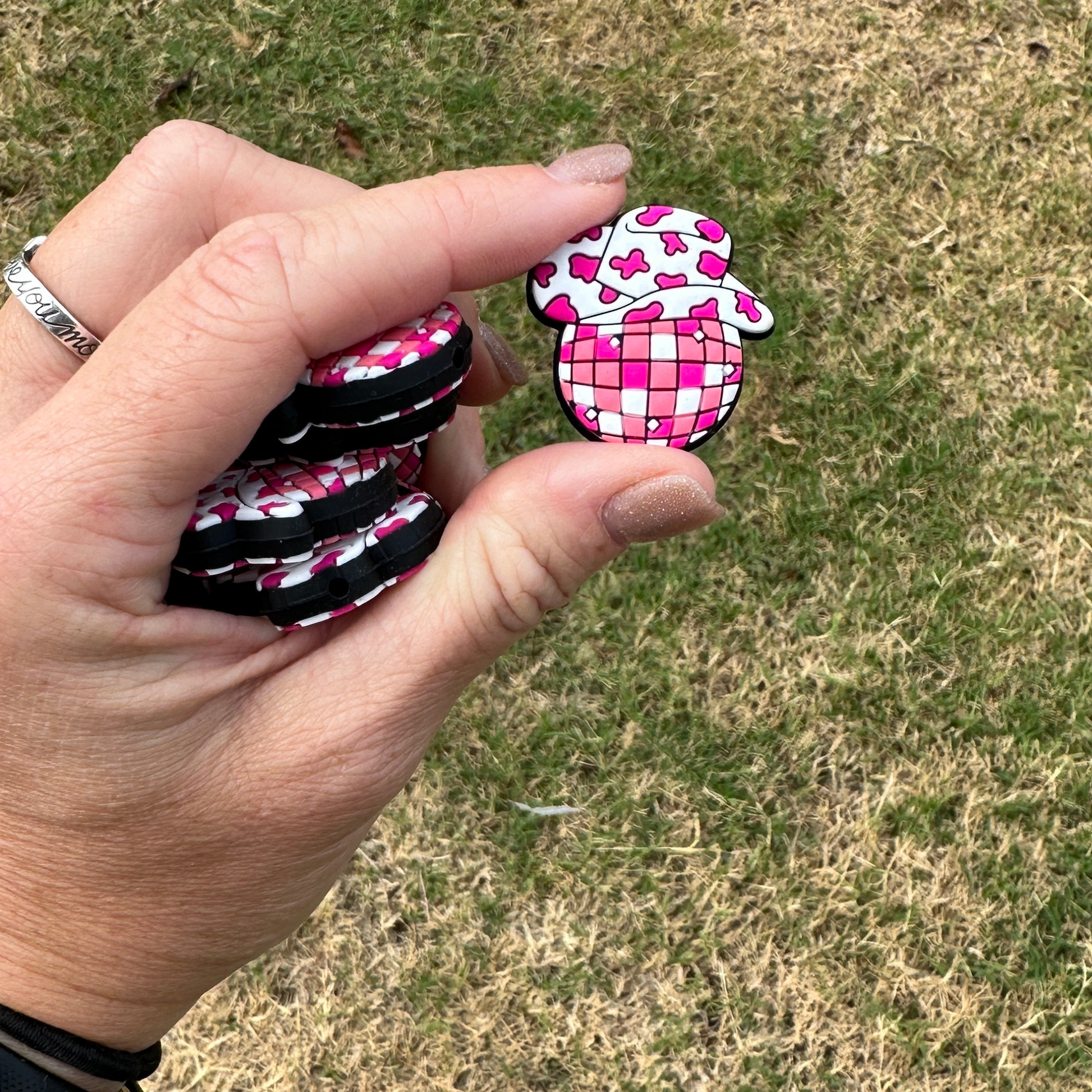 Our silicone focal beads are shaped like disco balls, adorned with adorable pink leopard cowgirl hats. It's a fusion of glitz, glamor, and cowgirl style, all in one bead. Each bead measures approximately 2.8cm by 2.8cm, offering endless creative possibilities.