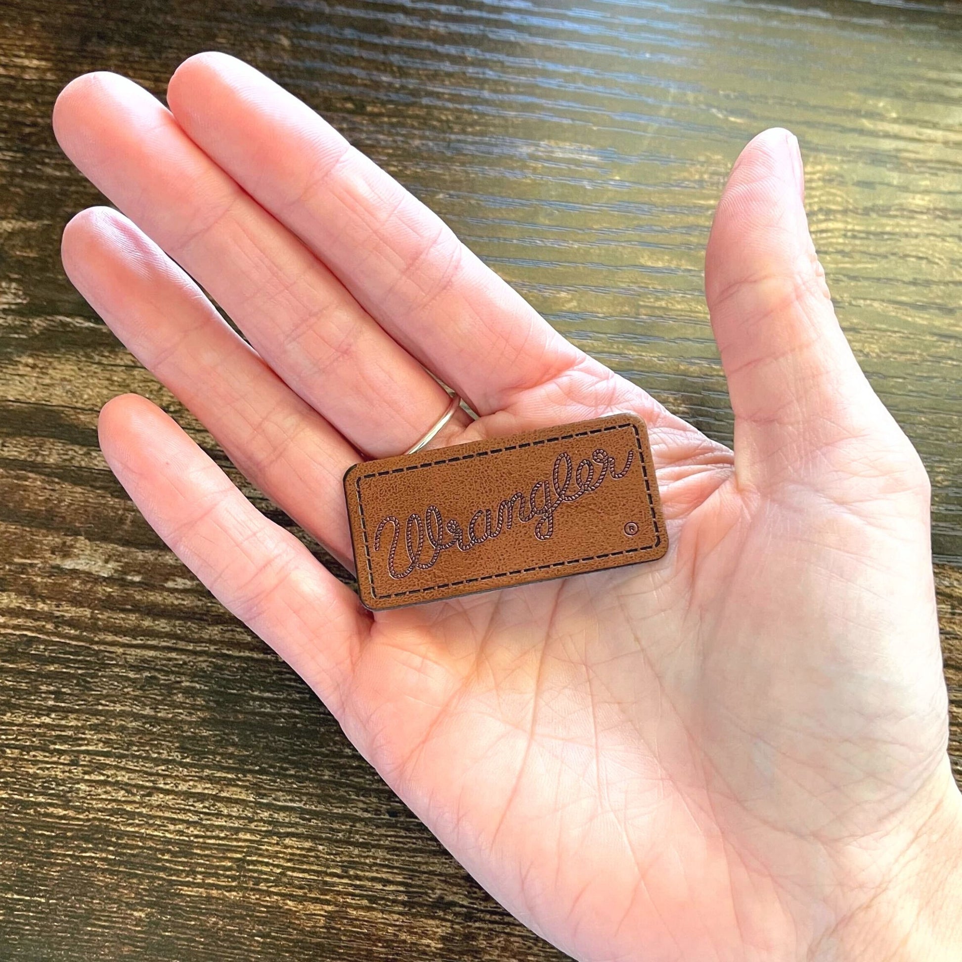 Includes faux leather stamped jean pocket patches. Size is 2 x 1" inches each patch is individually stamped with the word Wrangler.