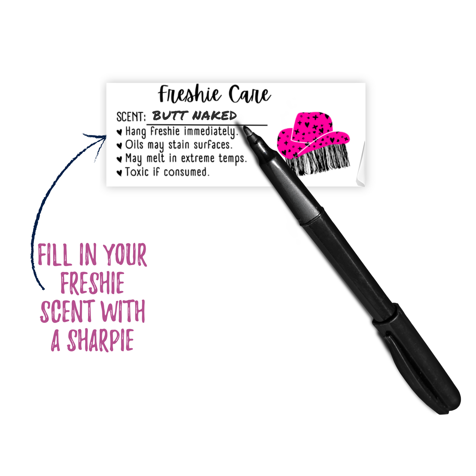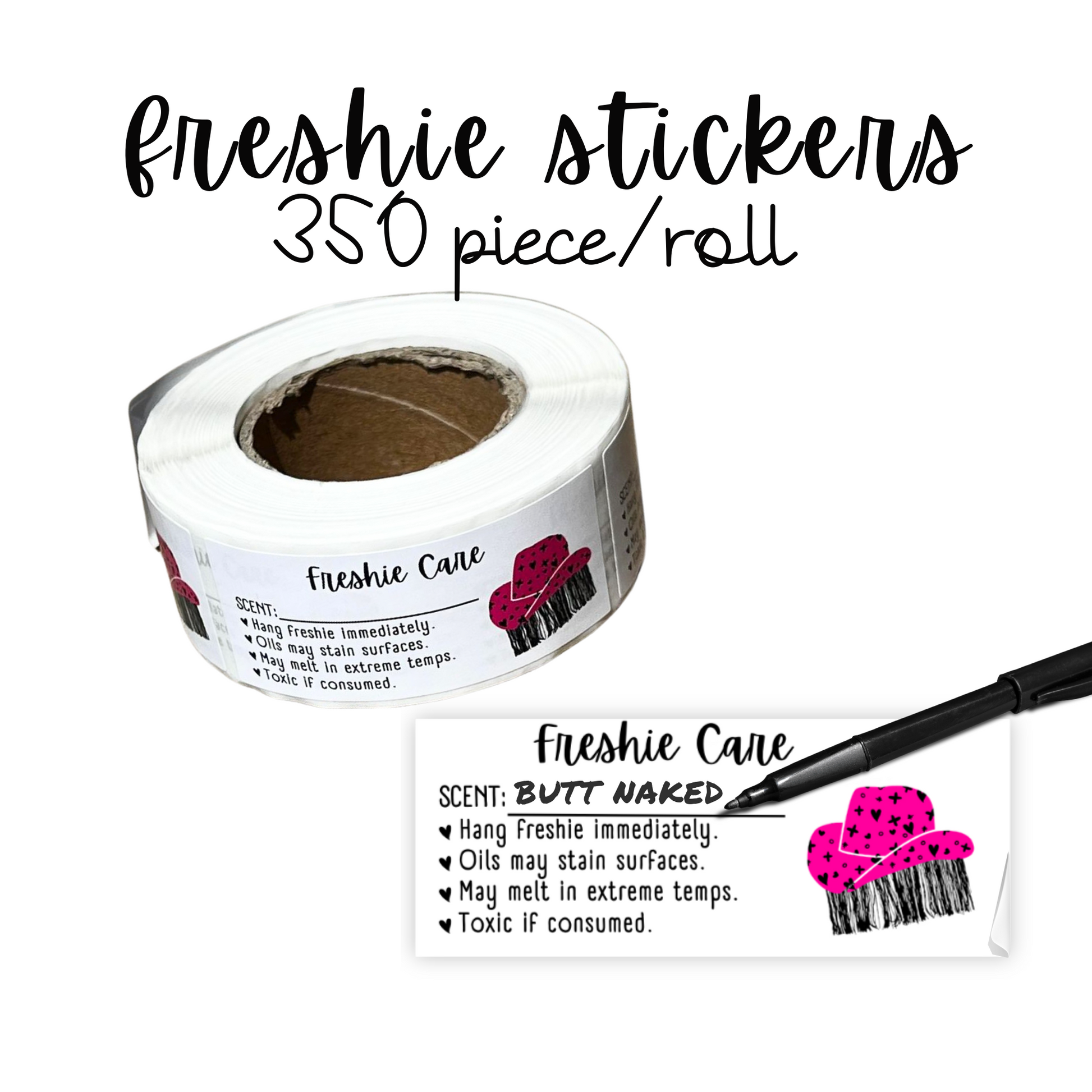 Includes physical printed Freshie Care Instruction Card Sticker with Line to Write in Scent. Size is 1x2.5” inches each sticker and come in a roll of 350.