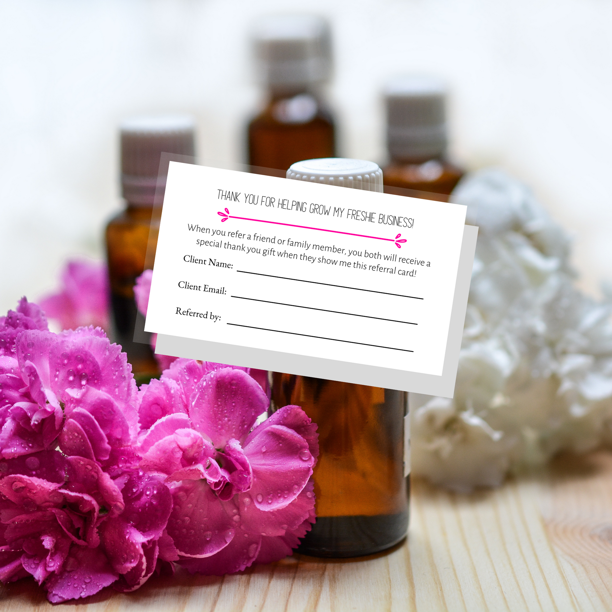 Flip the card over, and you'll find a heartfelt message: "Thank you for helping grow my freshie business! When you refer a friend or family member, you both will receive a special thank you gift when they show me this referral card!" This side also includes a space for the referrer to fill in their name, e-mail, and who referred them, making it a personal and interactive tool for tracking referrals and fostering a community around your business.