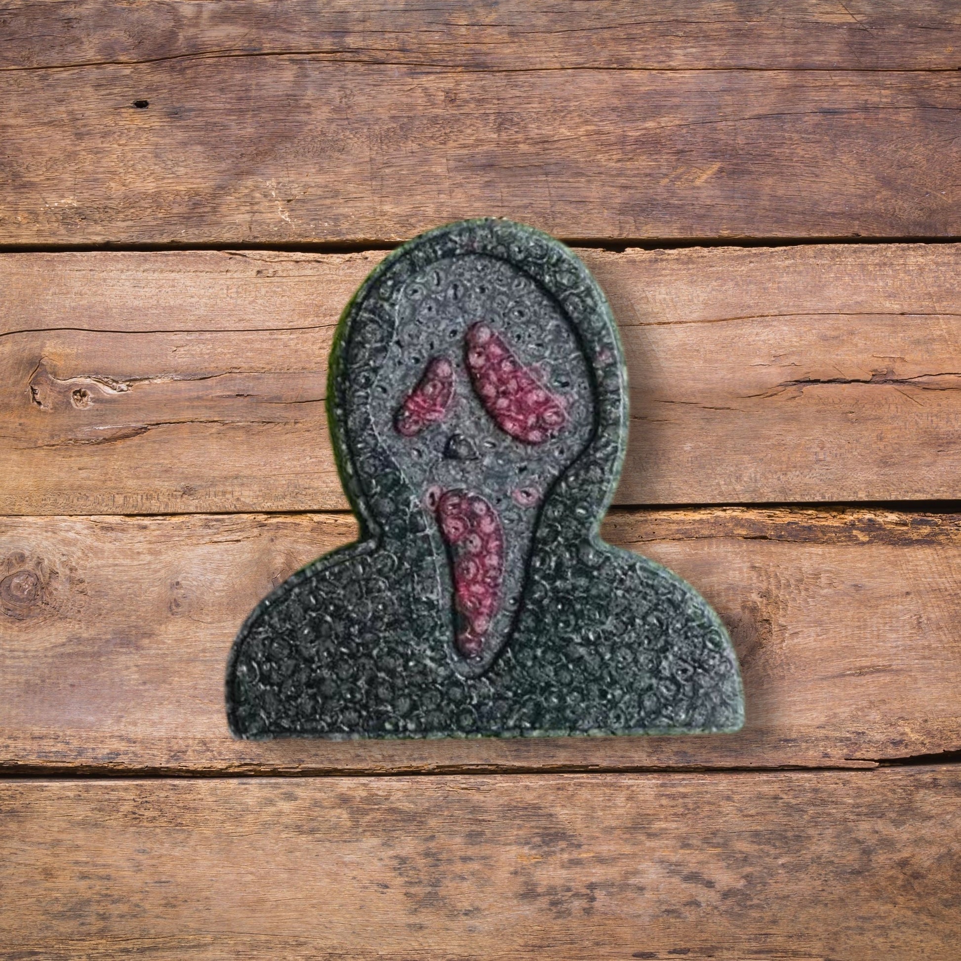 Includes 1 silicone mold in the shape of a Halloween Scary Scream Mask Killer Knife Freshie Mold! This mold measures 4" Tall x 4" Wide x 0.8" Deep, a thick durable quality silicone mold.