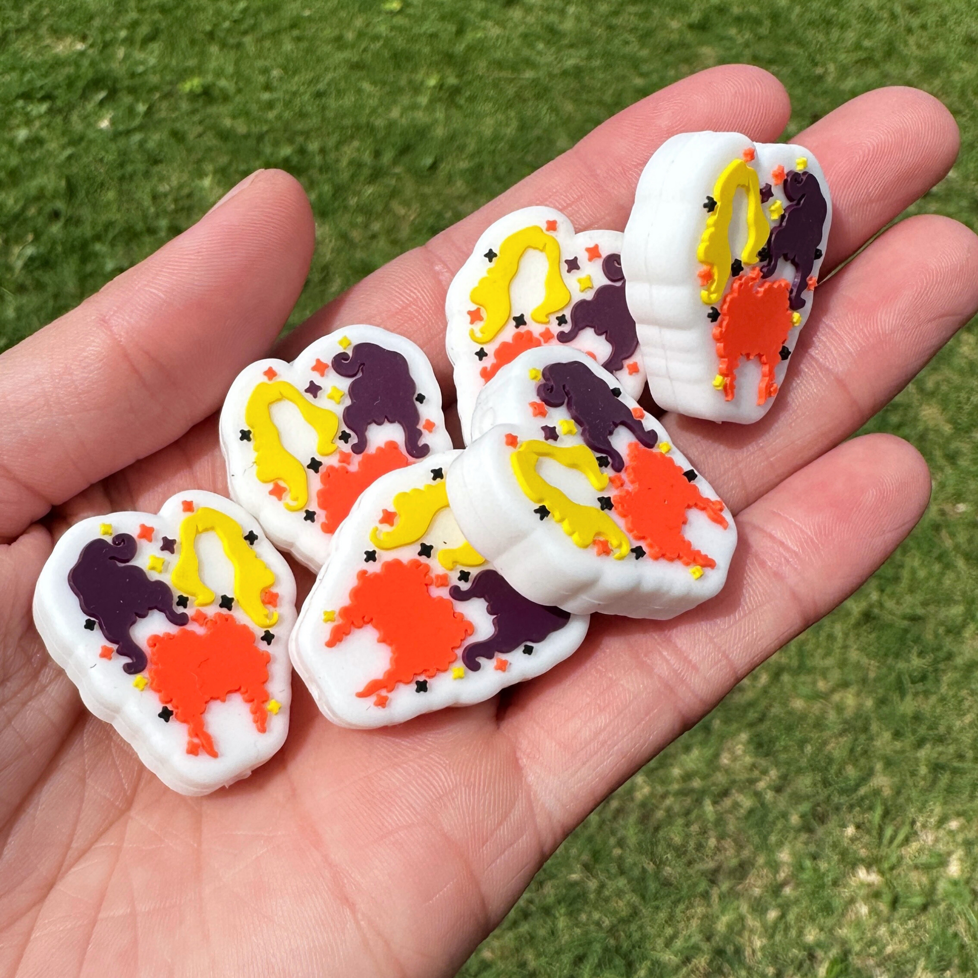 Receive 12 TOTAL silicone focal beads for your DIY or crafting project! They will all be the same 3 witch sisters from popular movie for halloween design. Sold for a small crafting business to use the silicone beads to make freshie hangers, bracelets, clips, teacher and nurse badge reels and more!