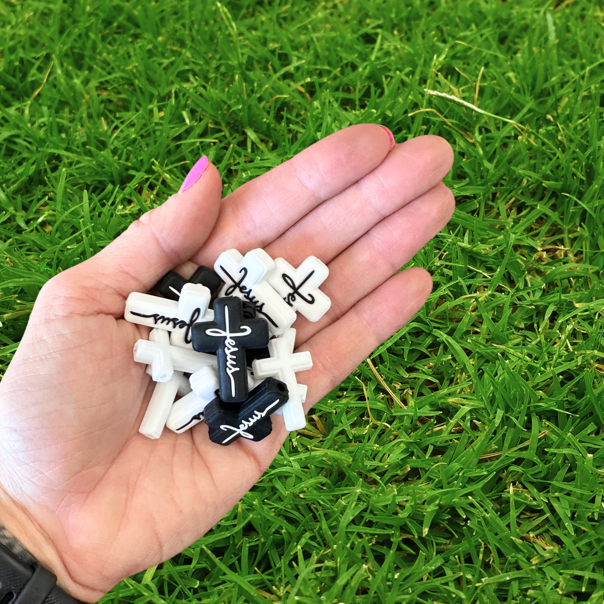 The set includes various crosses, each with unique characteristics. The black cross, measuring .9"x1.2", features the word "Jesus" in white. Additionally, there's a plain white cross at .7"x1.1" and another white cross with "Jesus" in black at .9"x1.2". These Christian focal beads are perfect for adding a meaningful touch to your creations.