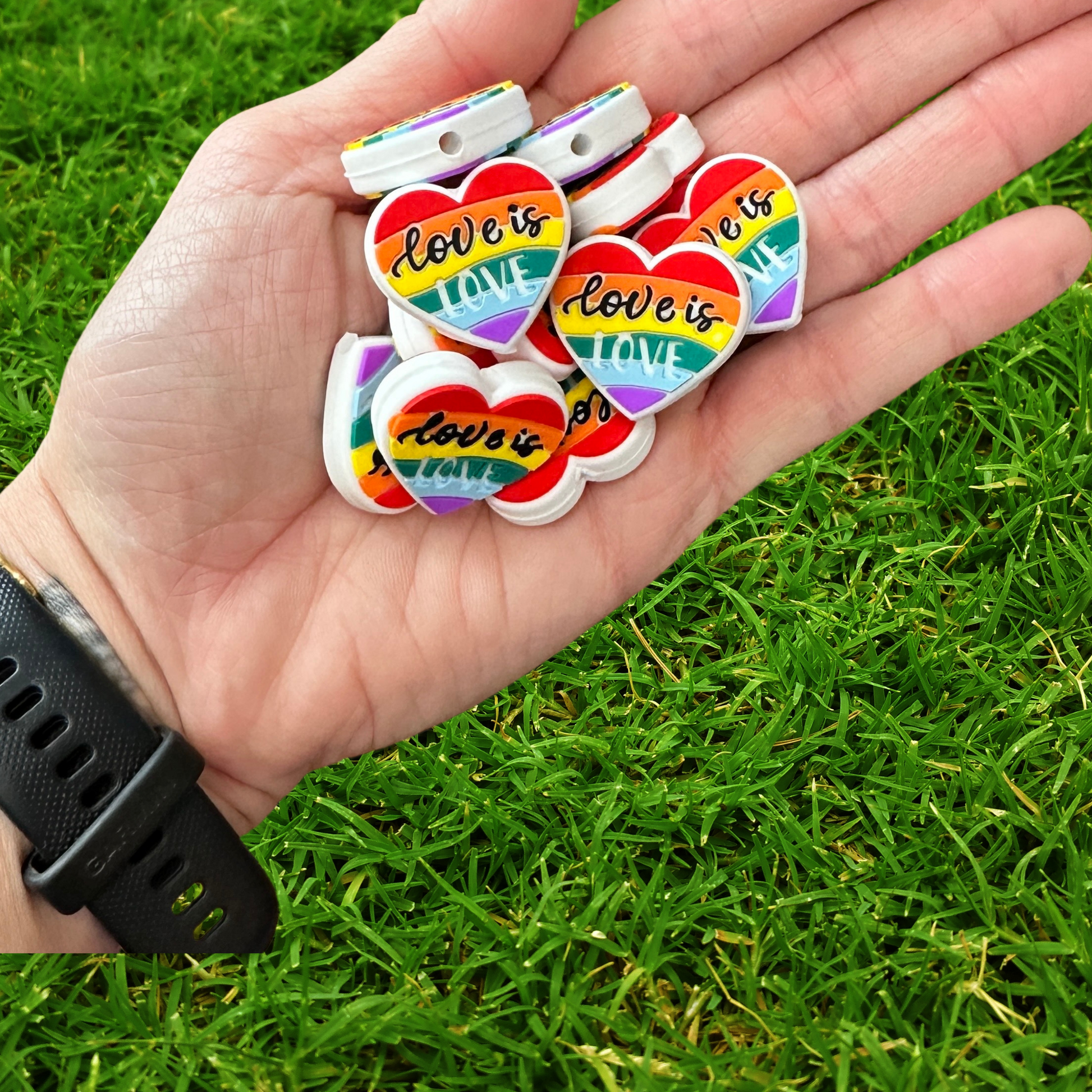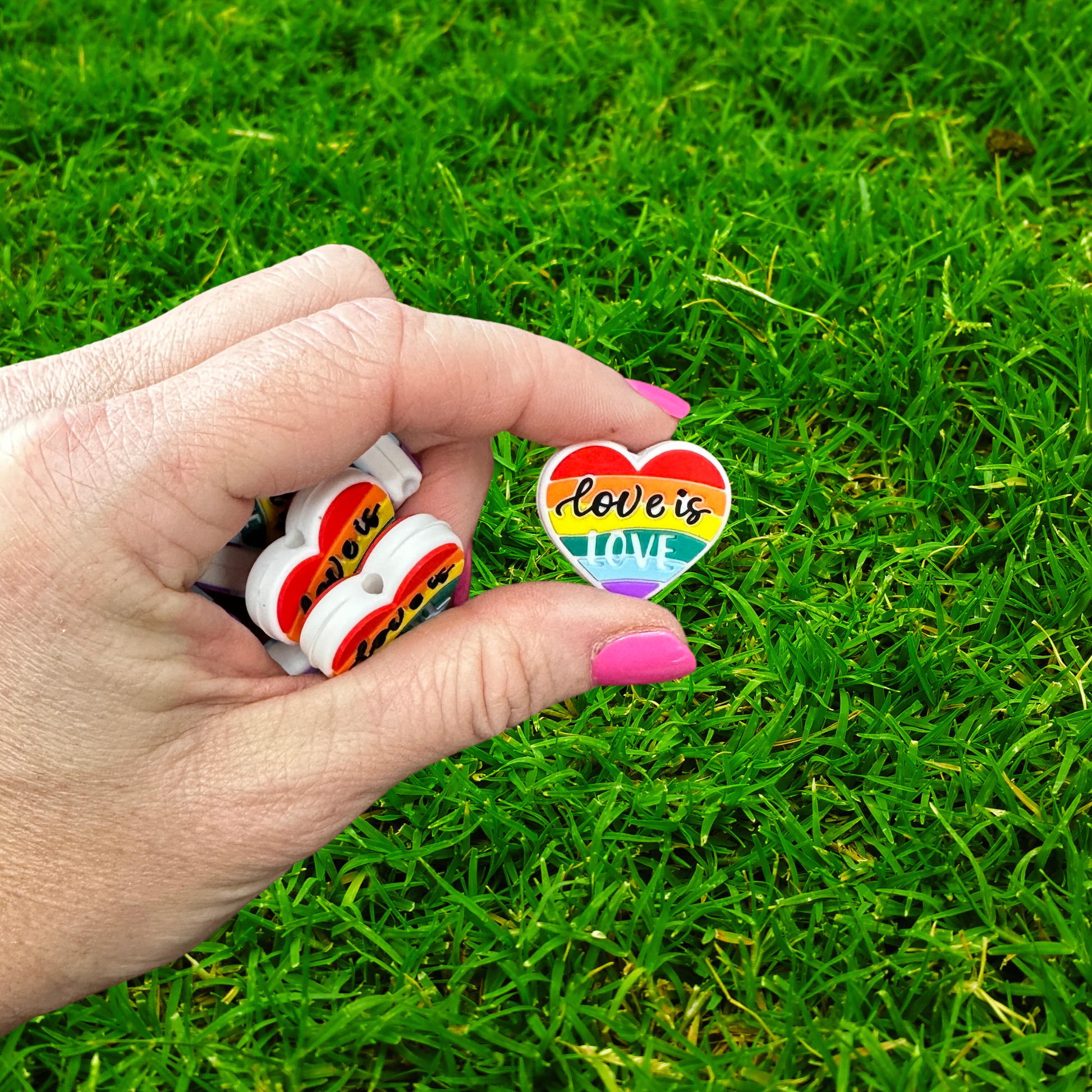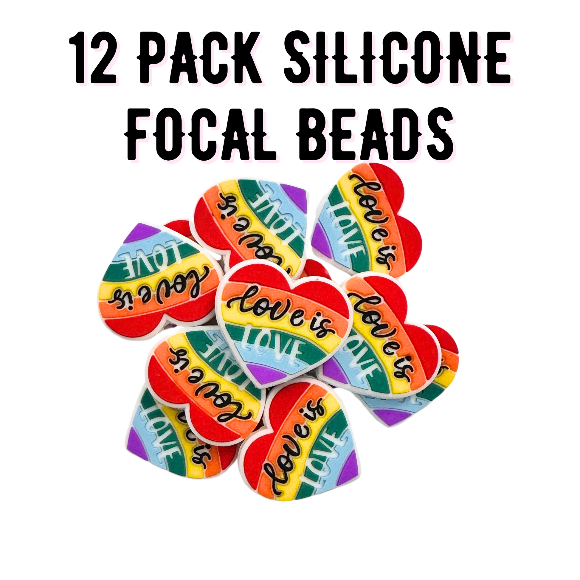 This 12 pack includes Love is Love Beads, show off your love is love pride with our silicone focal beads. Our 2.6cm x 2.4cm Love is Love Rainbow Pride Heart Silicone Focal Bead is easy to thread, much like 15mm, 20mm, 30mm, and 2mm beads out there.