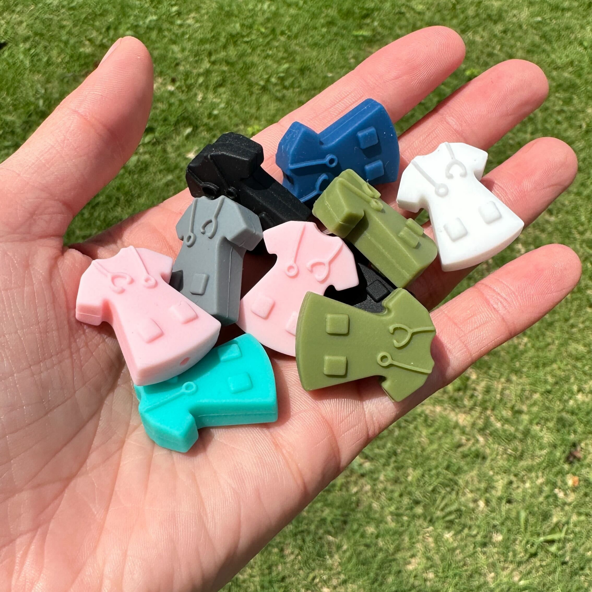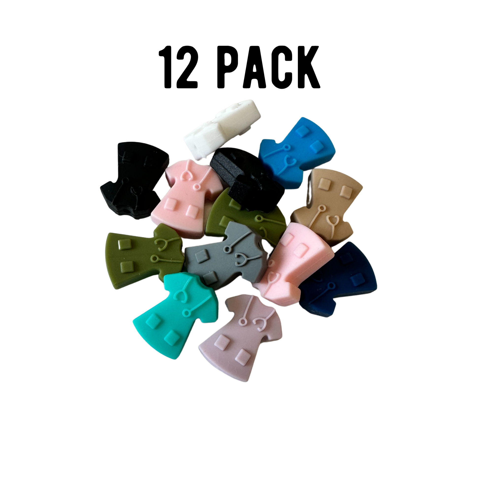 You will receive a bulk package of 12 total focal silicone beads. These were made with freshie makers in mind. They have a 2mm hole in the top that can be threaded onto string or bungee elastic with a bead loop or crochet loop. Most flat silicone character beads are 8 mm thick. The listing images will show the exact thickness, length, and height. These are large beads made of soft silicone perfect for teacher badge reels or clips.