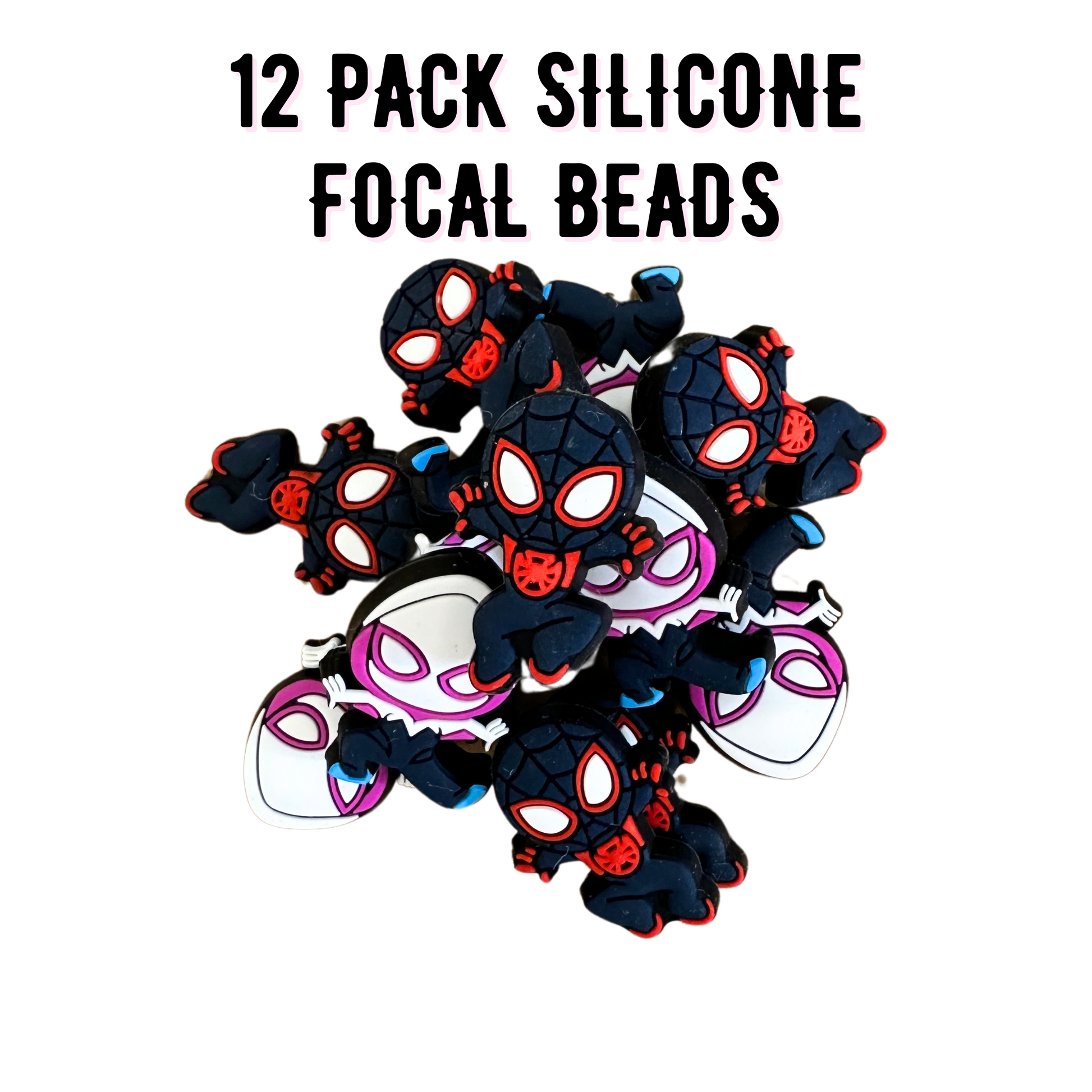 Introducing our Bulk 12-Pack of Gwen and Miles Spidey Silicone Focal Beads, specially designed to enhance your beaded lanyard, beaded pens, charms with sayings, and diy beads for bracelet projects! This variety pack includes beads of different sizes making them perfect for a variety of projects, making them perfect for a variety of projects, including building your assorted sets, DIY keychains, or designing beaded bracelets, rocs for charms, beaded garland, and more!