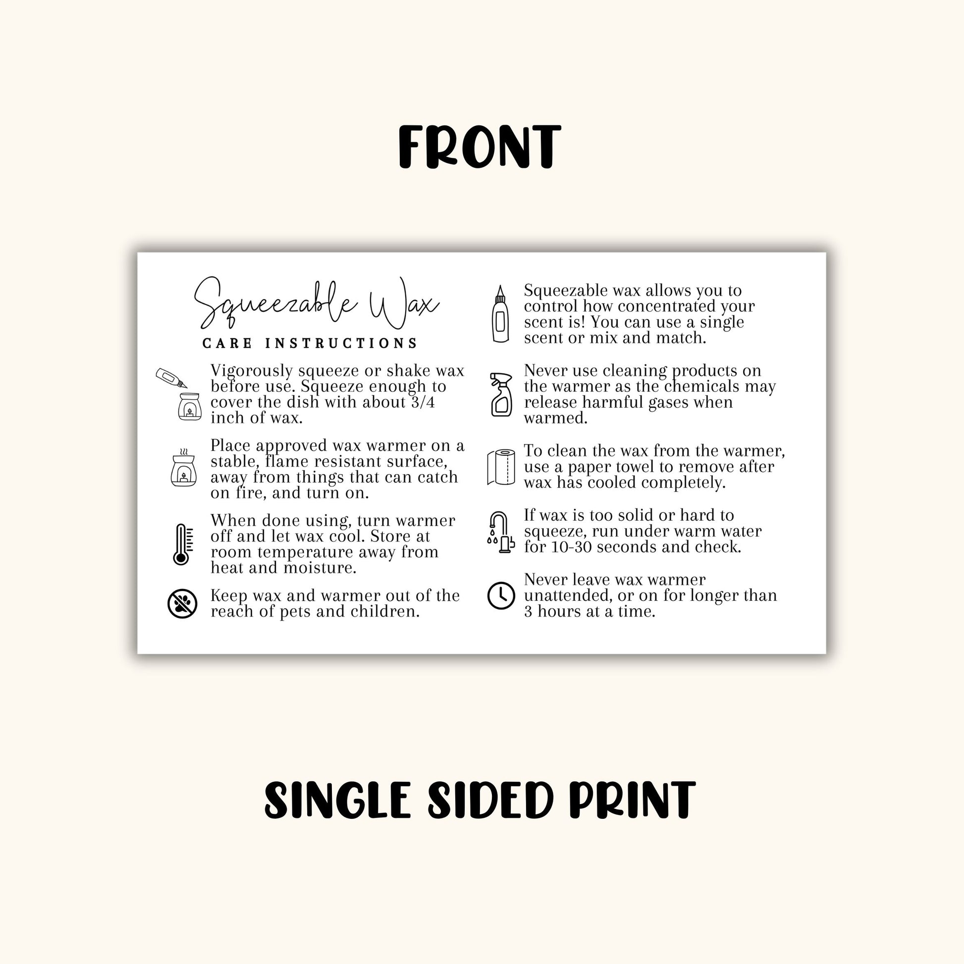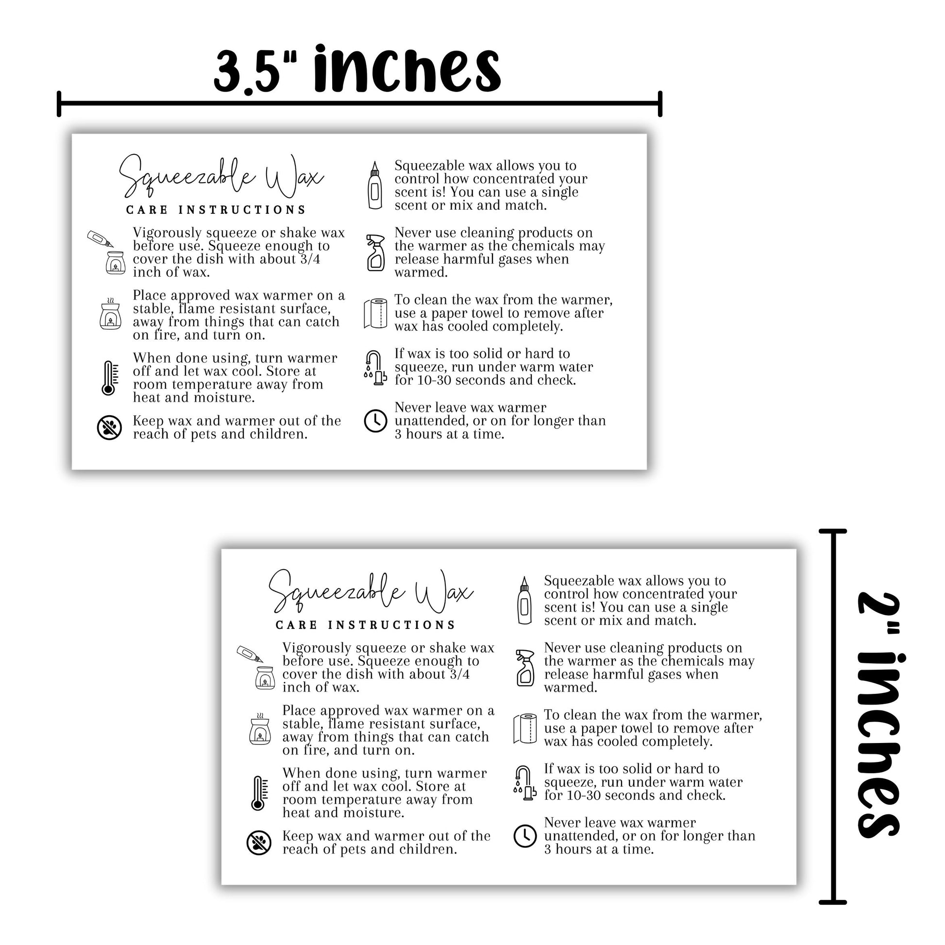 Squeezy Squeezable Wax Bottle Care Instruction Cards | 50 pk 3.5 x 2”
