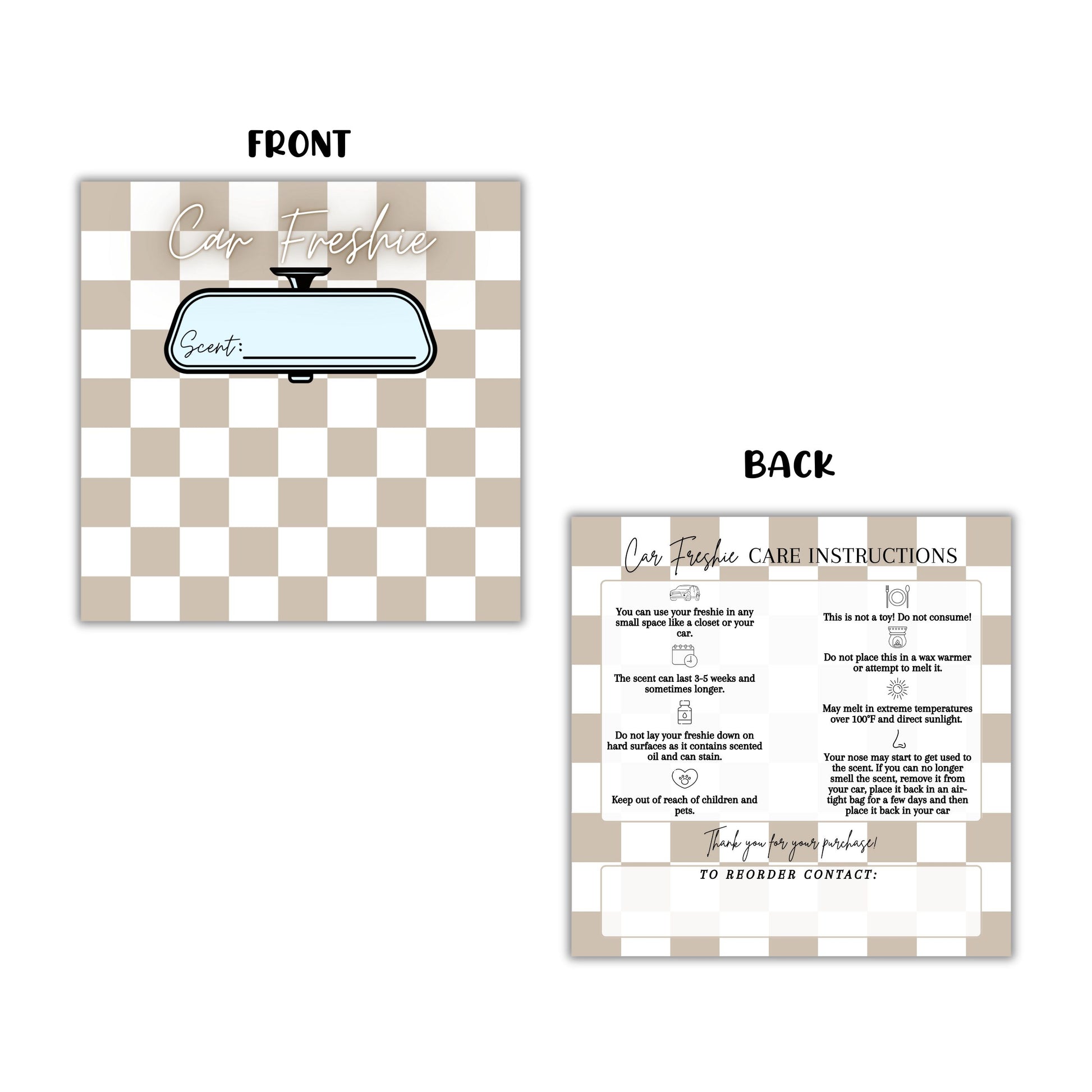 The tan checkered cardstock insert not only adds a personalized touch to each package but is also compatible with car freshie molds bulk, freshie hanger supplies, and car freshie inserts. These versatile inserts are an essential component for anyone looking to elevate their freshie DIY creations and streamline their freshie production process. Whether you're selling car freshies at a market, online, or as a gift, these cardstock bag inserts will ensure your products are beautifully presented and organized.