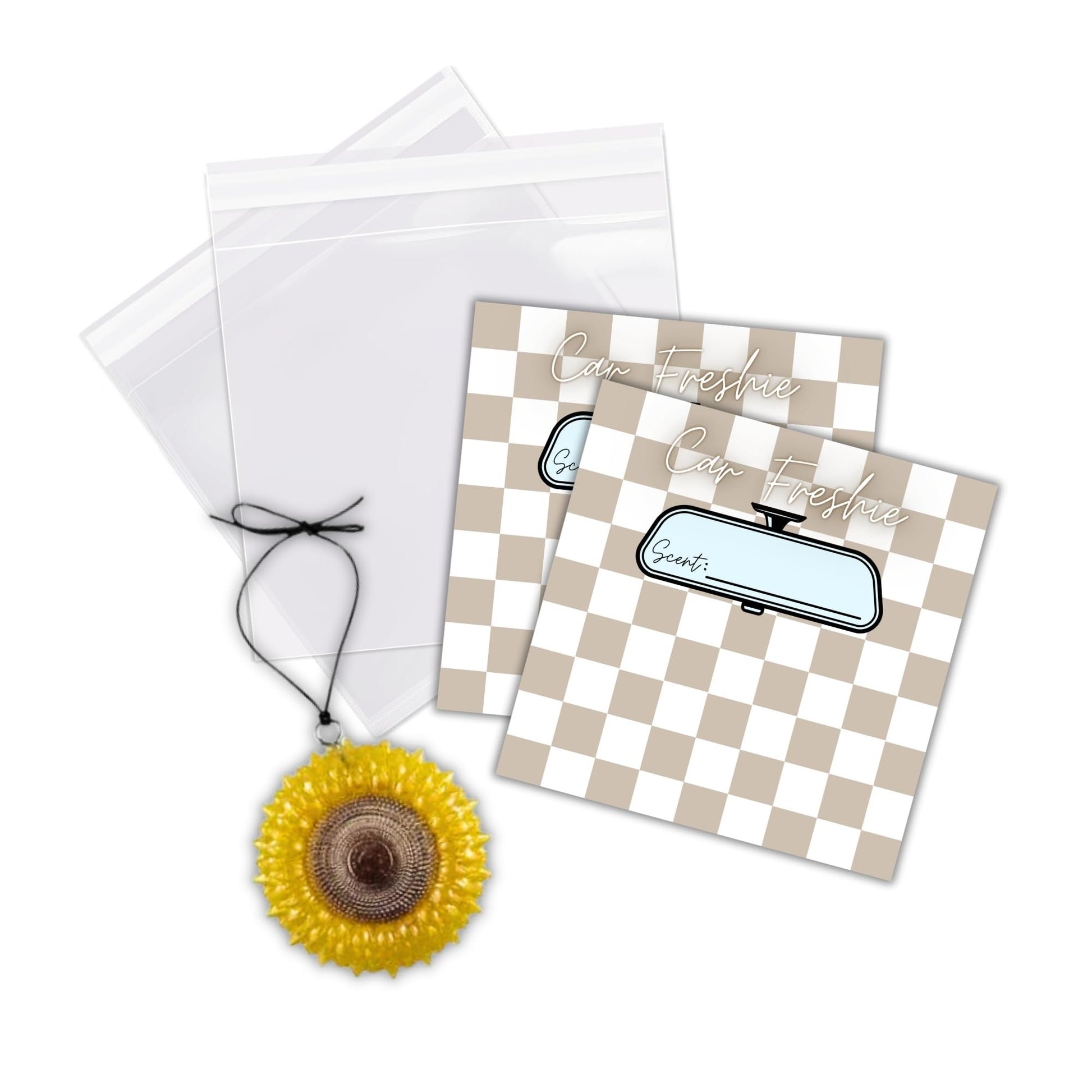 The tan checkered cardstock insert not only adds a personalized touch to each package but is also compatible with car freshie molds bulk, freshie hanger supplies, and car freshie inserts. These versatile inserts are an essential component for anyone looking to elevate their freshie DIY creations and streamline their freshie production process. Whether you're selling car freshies at a market, online, or as a gift, these cardstock bag inserts will ensure your products are beautifully presented and organized.