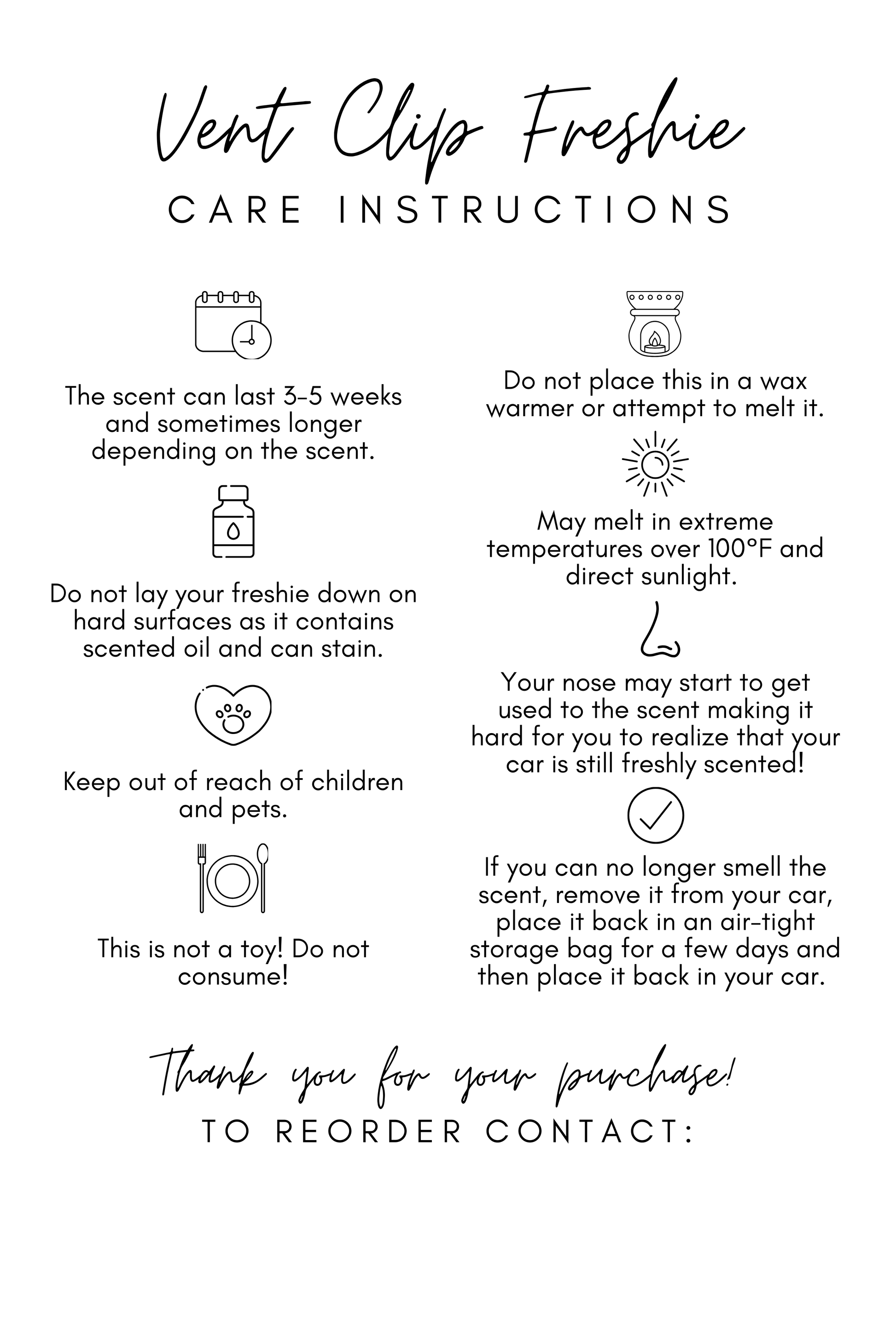 Each card includes detailed instructions on how to properly use and maintain car fresheners, including warnings like "Do Not Leave in Heat" to prevent scent degradation. The freshie care scent guidelines help customers get the most out of their sublimation freshie or customizable freshie by advising on the best placement, like using an air vent clip or a car freshie mirror scent sticker.
